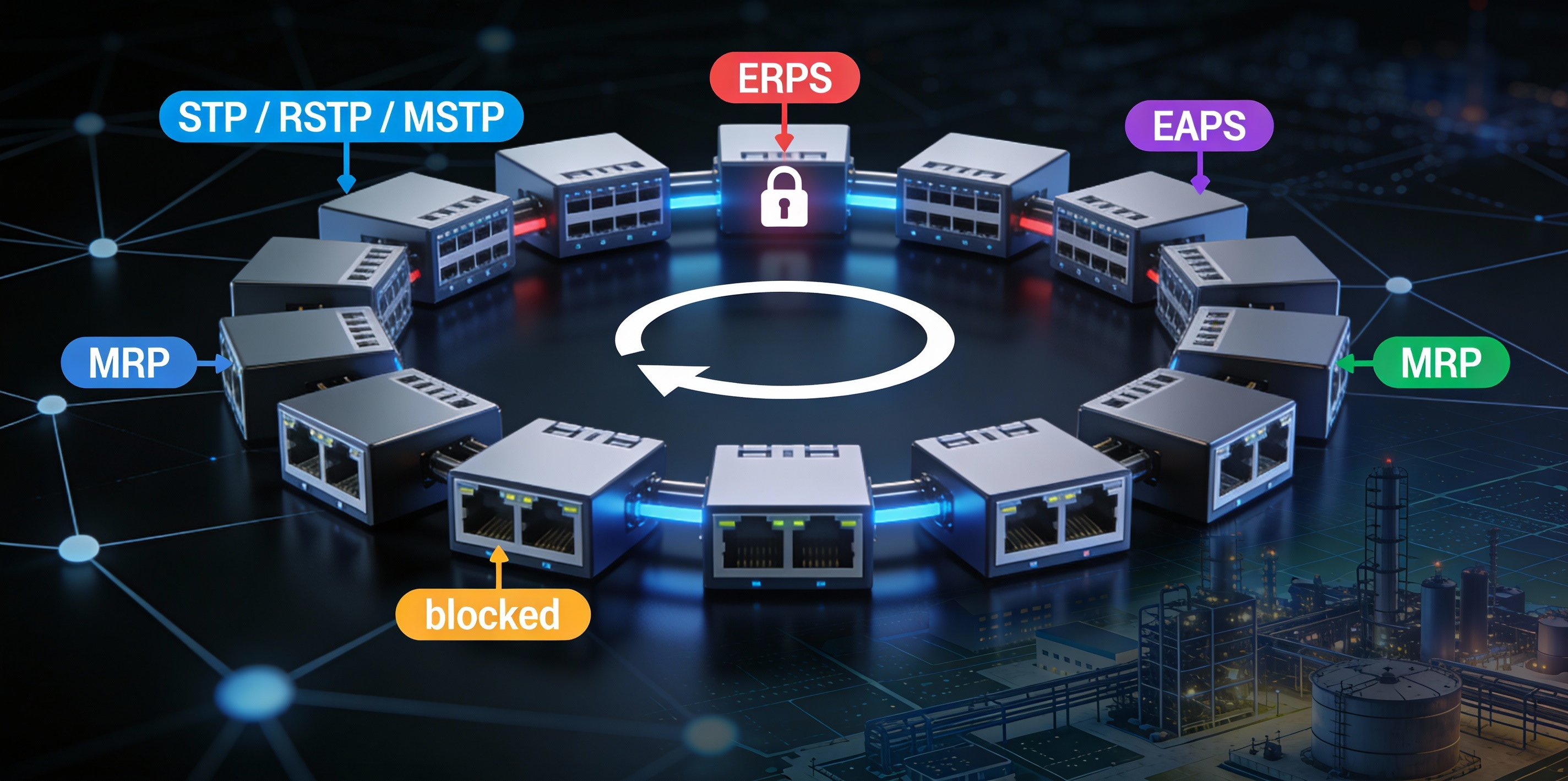 En infraestructuras Ethernet industriales, existen diversos protocolos de redundancia en anillo. Este artículo se centra en los más comunes y estandarizados: